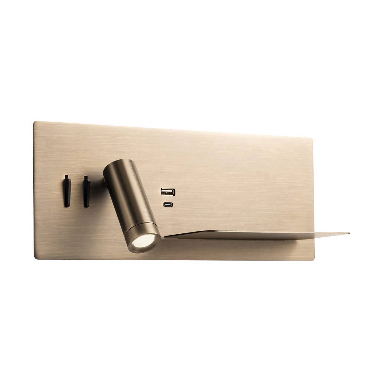 Aplice pentru interior echipate cu led-uri SMD, structură din metal cu suport pentru telefon, vopsită alb mat, aur mat, antic bronz sau negru mat, dispersor lateral din acryl satinat. Dotate cu port USB și întrerupătoare