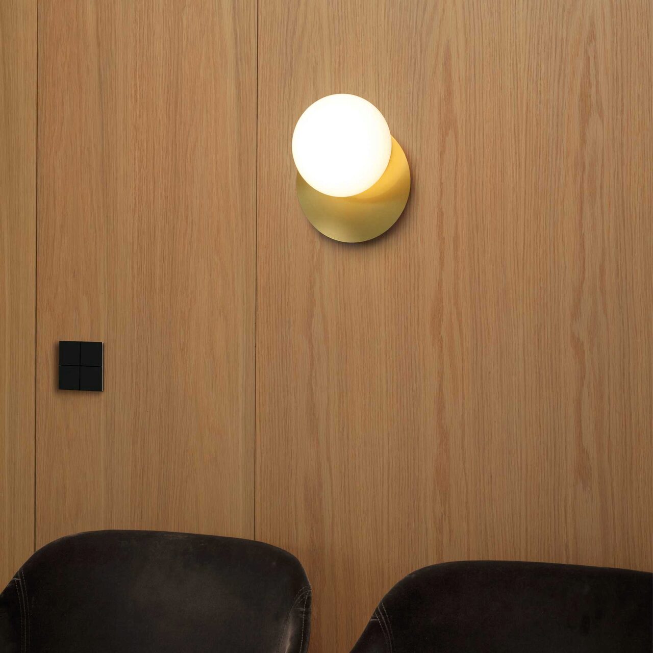 Aplica moderna din colectia Ninfea cu baza metalică acoperită cu pulbere sau metal placat. Abajurul este din sticlă albă, suflată și gravată. Finisaj alama satinata.