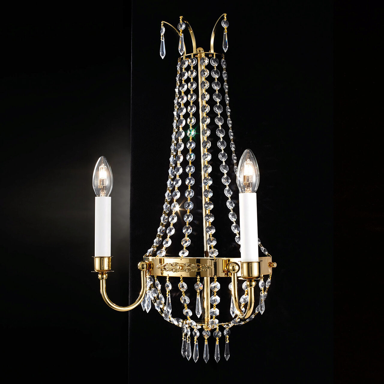 Aplica din colectia Empire Crystal ce corespunde stilului clasic cu decoratii Empire, lucrata manual din alama masiva finisata aur 24 K, decorata cu cristale Scholer. Colectia Empire Crystal e vasta si cuprinde mai multe modele de candelabre, aplice, plafoniere si pendule finisate aur 24 K, argint antichizat si alama patinata. Alama, indiferent de finisaj, este protejata cu un strat de lac aplicat la finalul procesului de fabricatie.
