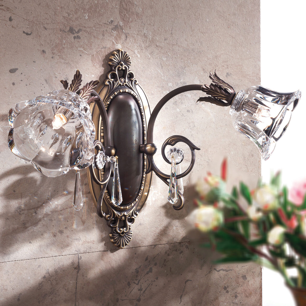 Aplica La Boheme cu 2 brate, lucrata manual din alama masiva patinata, realizata in stilul clasic italian interpretat modern. Alama este lucrata cu mare atentie la detalii, bogat decorata, iar abajururile sunt din cristal "24% High lead crystal", taiate manual. Aplica face parte din colectia La Boheme, o colectie eleganta si mereu actuala, care cuprinde aplice simple, duble si triple, candelabre (fiecare candelabru La Boheme poate fi utilizat atat ca candelabru, cat si ca plafoniera), plafoniere, veioze si lampadare, aurite si patinate. Mai mult, alama ce formeaza structura acestor corpuri de iluminat (indiferent de tipul finisajului) este protejata cu un strat de lac aplicat la finalul procesului de fabricatie.