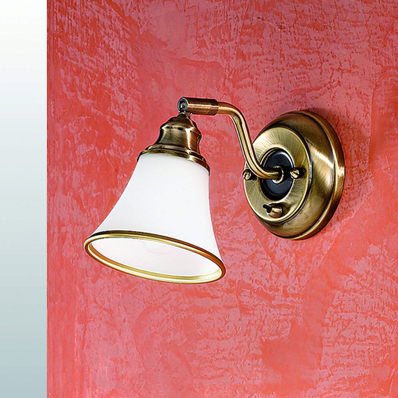 Aplica clasica cu note vintage, finisata alama patinata, cu abajururi din sticla opal cu bordura bronz.