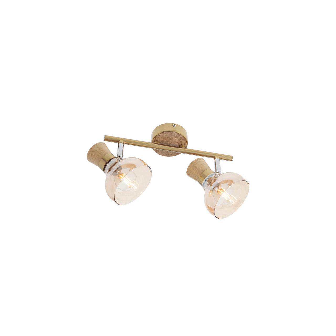Aplica/plafoniera pentru interior, structura din metal finisat aur antichizat cu decorațiuni vopsite tip lemn natur, abajururi din sticla ambra transparenta. Becurile nu sunt incluse.