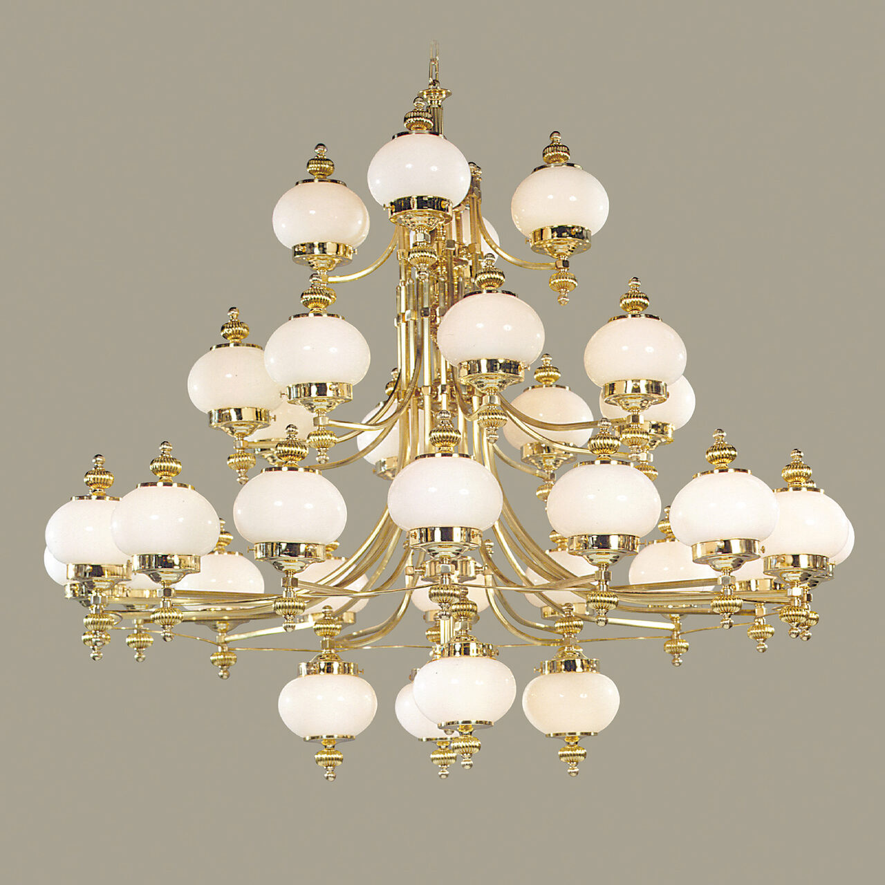 Candelabru Wiener Nostalgie cu 32 brate dispuse pe 4 nivele, lucrat manual din alama masiva lucioasa, realizat in stil clasic vienez. Elegant, cu o prezenta impunatoare data de echilibrul formelor si al proportiilor la care se adauga abajururile cu contururi rotunjite din sticla opal, candelabrul Wiener Nostalgie este una dintre alegerile cele mai bune pentru iluminatul sufrageriei, livingului decorate clasic. Candelabrul face parte din colectia cu acelasi nume, o colectie vasta ce reprezinta cu succes brandul Orion, care cuprinde aplice simple si duble, candelabre, plafoniere, veioze si lampadare din alama lucioasa si patinata, cu abajururi opal sau champagne. Candelabrele Wiener Nostalgie sunt inclusiv in productia de serie realizate si la dimensiuni mari, monumentale, fiind destinate proiectelor speciale (spatii private sau publice, spatii culturale sau biserici). Mai mult, alama ce formeaza structura acestor corpuri de iluminat (indiferent de tipul finisajului) este protejata cu un strat de lac aplicat la finalul procesului de fabricatie.