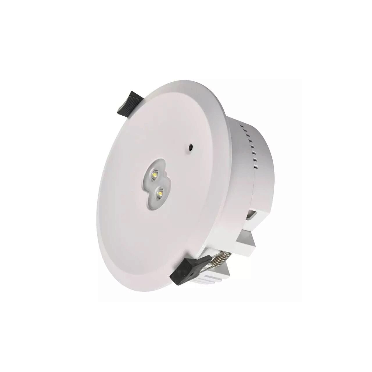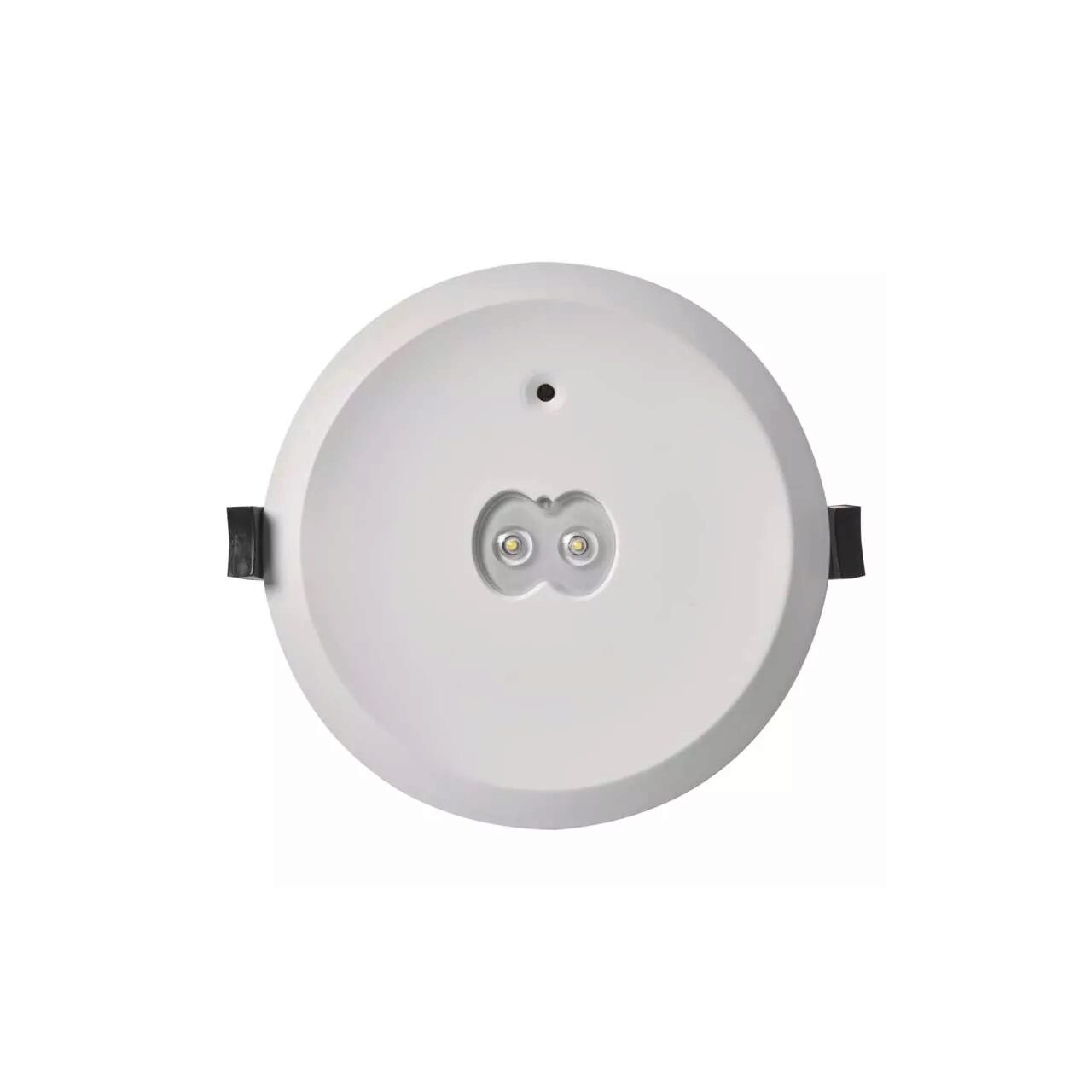 Corp de iluminat de siguranta echipat cu LED-uri, rotund incastrat recomandat pentru interior. Regim de functionare nepermanent cu o autonomie de functionare de 3 ore. Fabricat din policarbonat de culoare alba cu sursa de lumina LED.