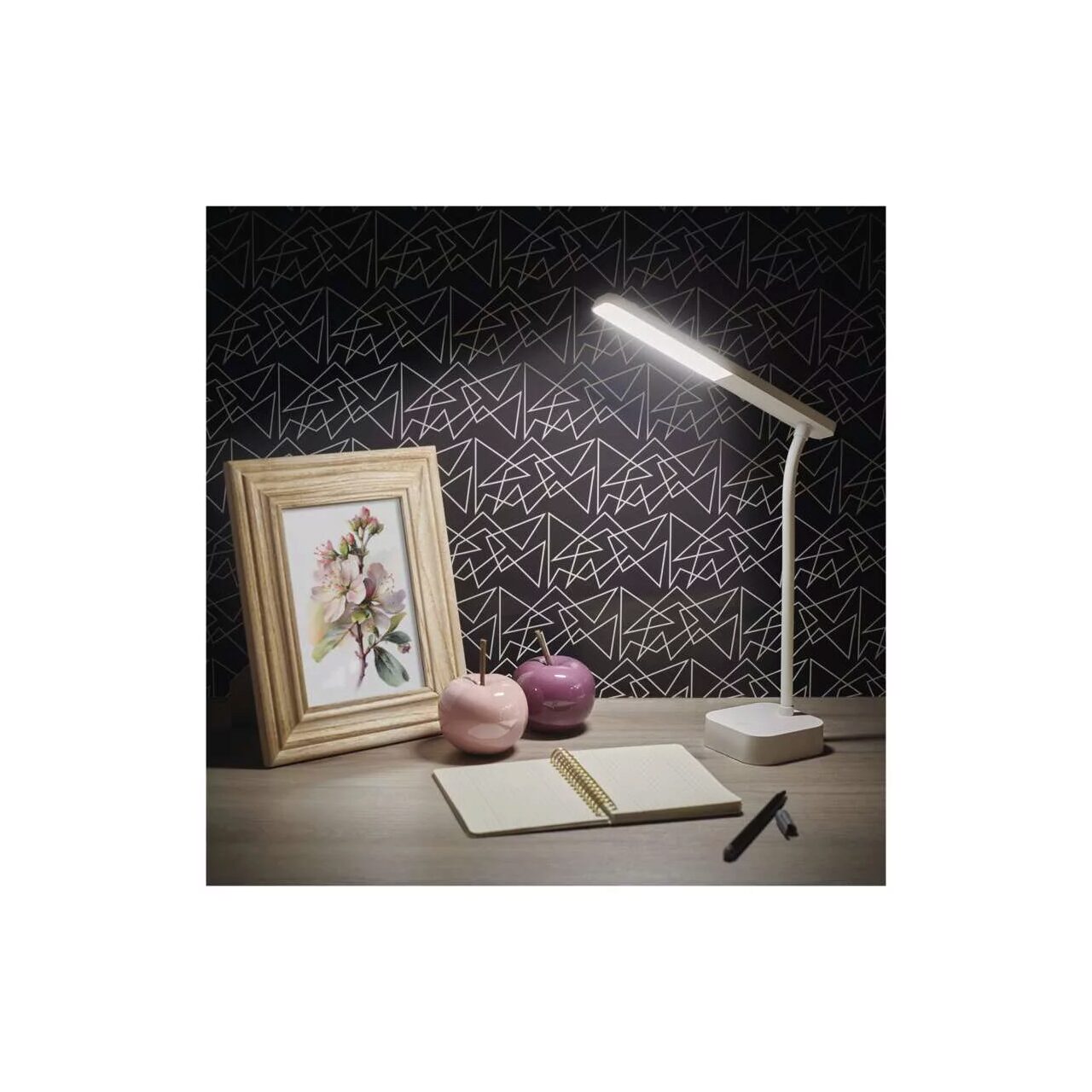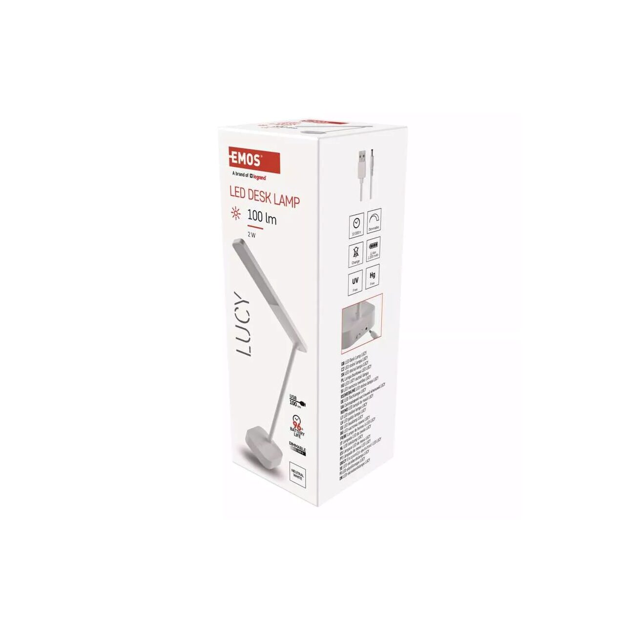 Lampa de birou alba, stil minimalist, dimmabila, 100lm, 2W, Emos Z7626. Lampa se remarca prin forma simpla dreptunghiulara cu buton tactil, temperatura de culoare 5000K, protectie IP20, lugime cablu 1 m, durata de viata de 10000 ore, durata bateriei pana la 96 h.