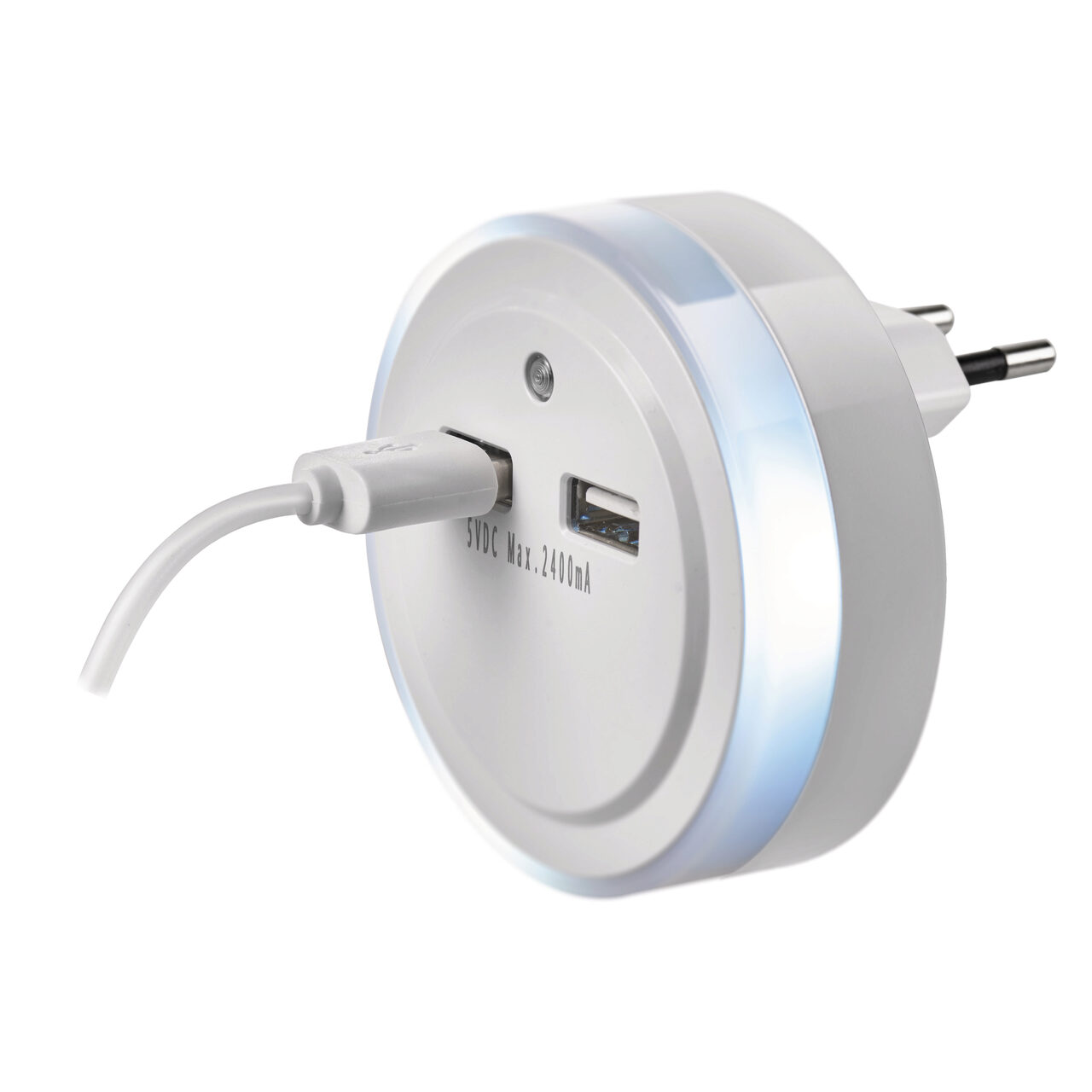Lampa de veghe cu fotocelula incorporata si doua porturi USB pentru incarcrea diferitelor dispozitive (5V, 2400 mAh). Fotocelula detecteaza intensitatea luminoasa si are functia pornire / oprire automata. Pornirea se face la o intensitate <5 lux, iar oprirea la o intensitate > 20 lux. Tensiune de alimentare nominala 230V/50Hz. Culoarea lampii este alba.