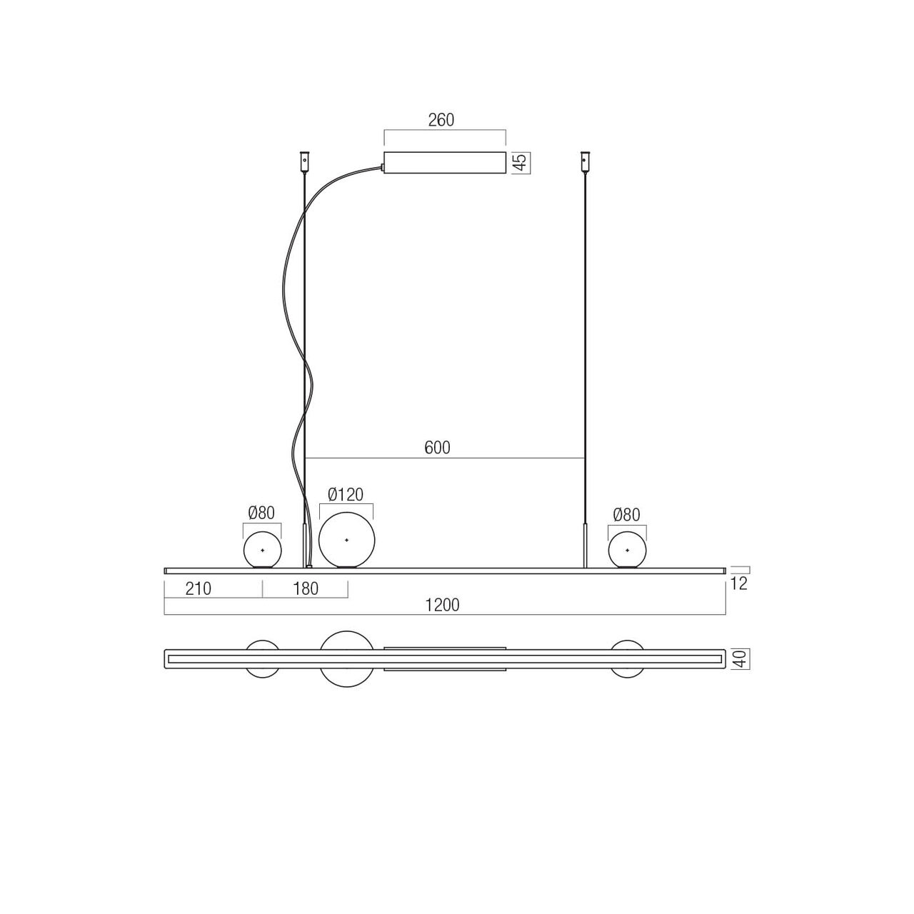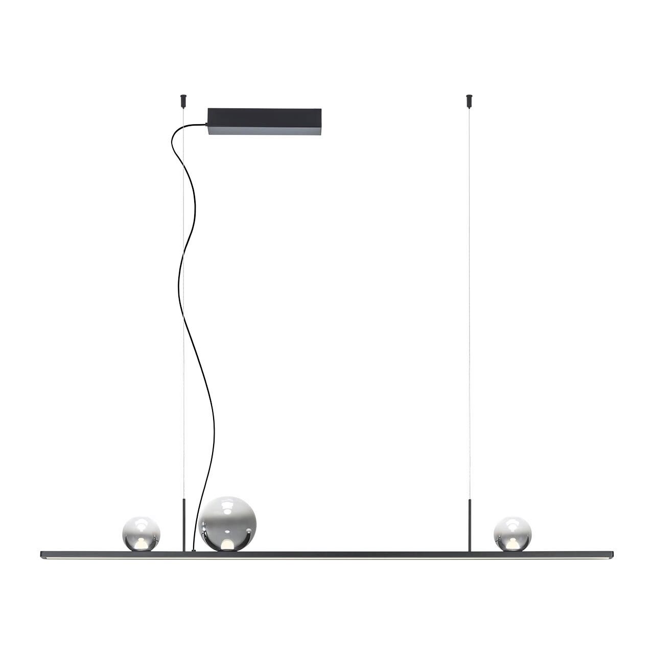 Lustre echipate cu LED-uri SMD și COB, dimabile TRIAC, cu distribuție directă/ambientală a luminii. Structură din aluminiu extrudat, finisată alamă mată aurie sau vopsită negru mat, prevăzută cu un dispersor din policarbonat alb opal pentru lumina directă și trei sfere din sticlă suflată alb opal sau fumuriu degrade pentru lumina ambientală.