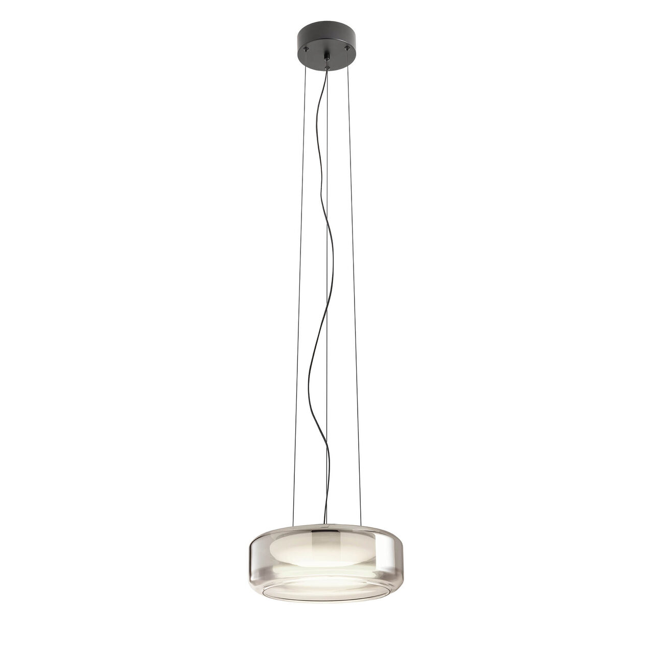 Structura lămpii este realizată din metal și aluminiu, vopsită cu câmp electrostatic în culoare negru mat, adăugând un plus de eleganță și rafinament. Două dispersoare din sticlă suflată completează designul unic al lămpii, având o nuanță fumurie degrade la exterior și alb opal la interior.