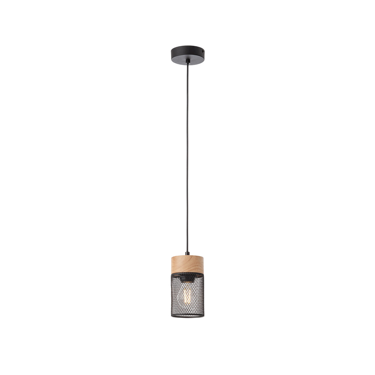Lustra pentru interior, structură din metal vopsit negru mat cu element din lemn natur, dispersor din rețea metalică vopsit negru mat.