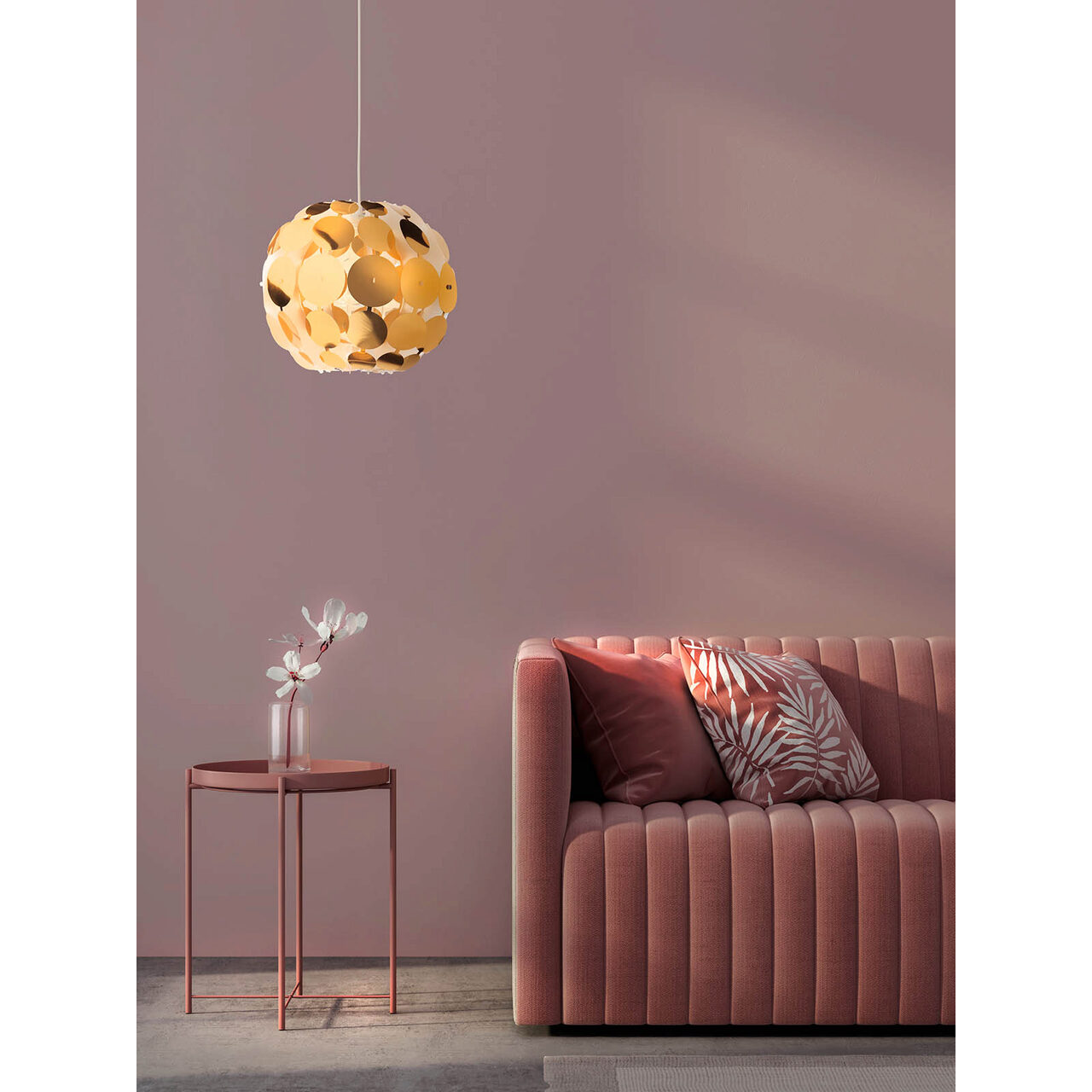Pendul pentru interior, structura din plastic alb și plastic transparent, abajur din elemente de polipropilena aurie.