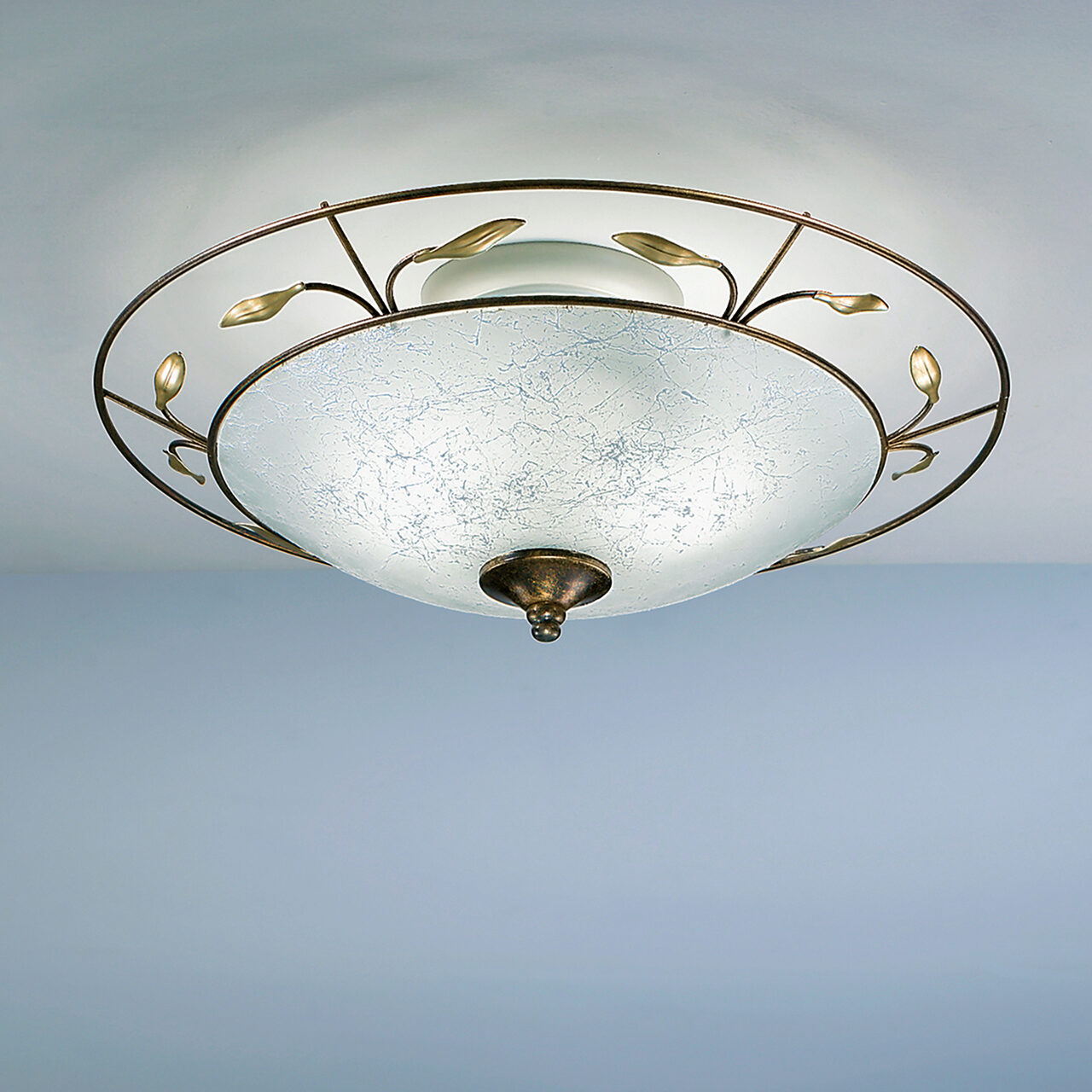 Plafoniera florentina Luca finisata maron antichizat. Stilul florentin este din ce în ce mai utilizat de designeri si este definit de forme sinuoase, iar din punct de vedere cromatic, se inspiră din natură, predominând galbenul, verdele, teracota, cremul sau albastrul. Delicat decorata cu motive florale, frunze brun-aurii, cu dimensiuni mari (diametru 40 cm), cu abajurul din sticla antichizata, plafoniera Luca devine elementul de referinta al oricarui interior in care este amplasat. Colectia Luca cuprinde un candelabru, aplice duble si simple si o plafoniera.