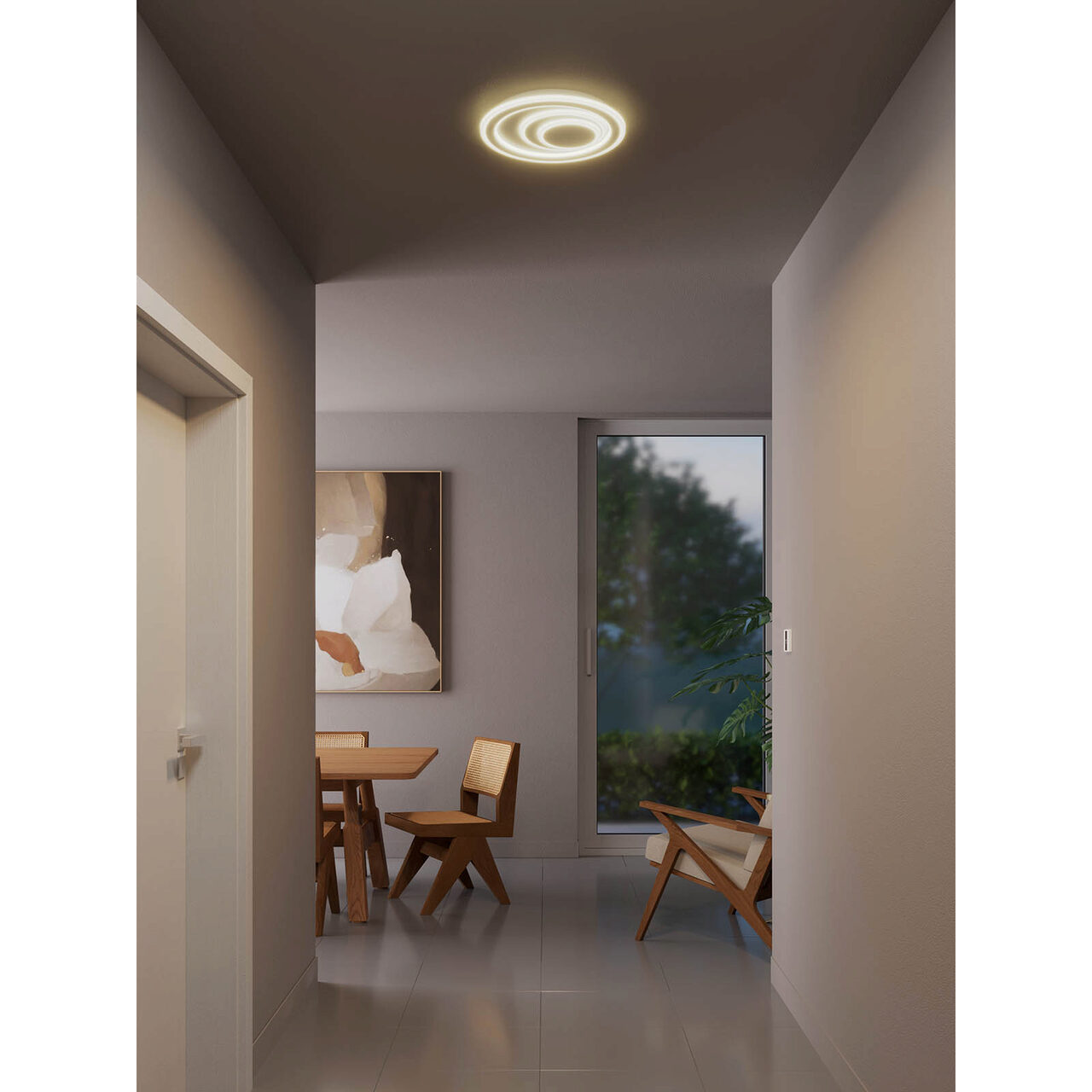 Plafonieră pentru interior, echipată cu LED-uri SMD, structură din metal vopsită alb mat, dispersor din acryl alb satinat.
