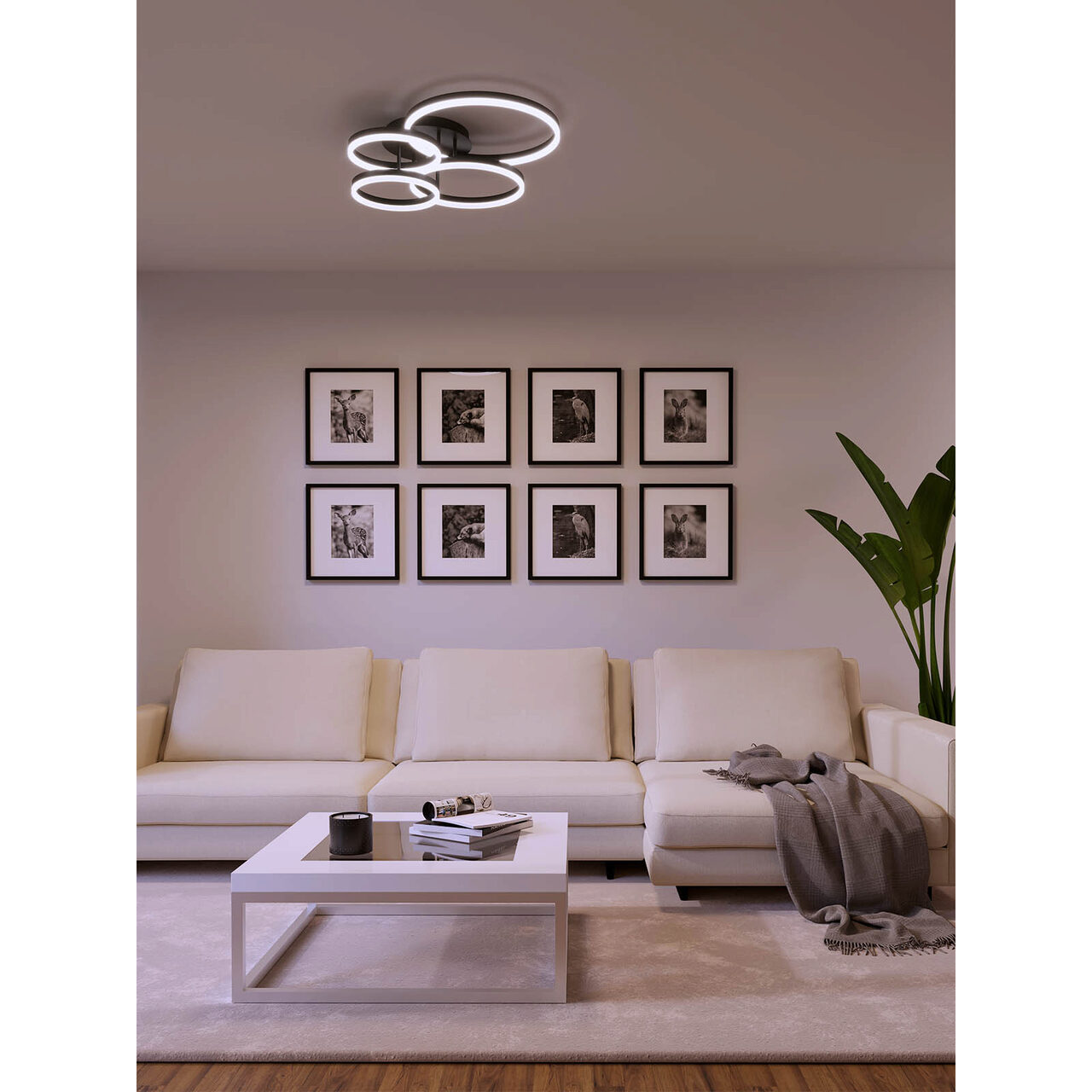 Plafonieră pentru interior, echipată cu LED-uri SMD, cu posibilitate de selectare a temperaturii de culoare a luminii, bază din metal vopsită alb mat cu structură din aluminiu vopsită negru mat, dispersoare din acryl satinat.