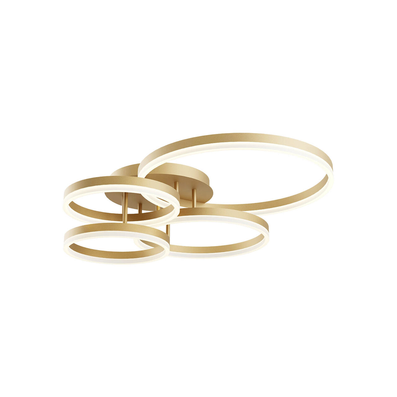 Plafonieră pentru interior, echipată cu LED-uri SMD, cu posibilitate de selectare a temperaturii de culoare a luminii, structură din metal și aluminiu vopsită auriu mat, dispersoare din acryl satinat.