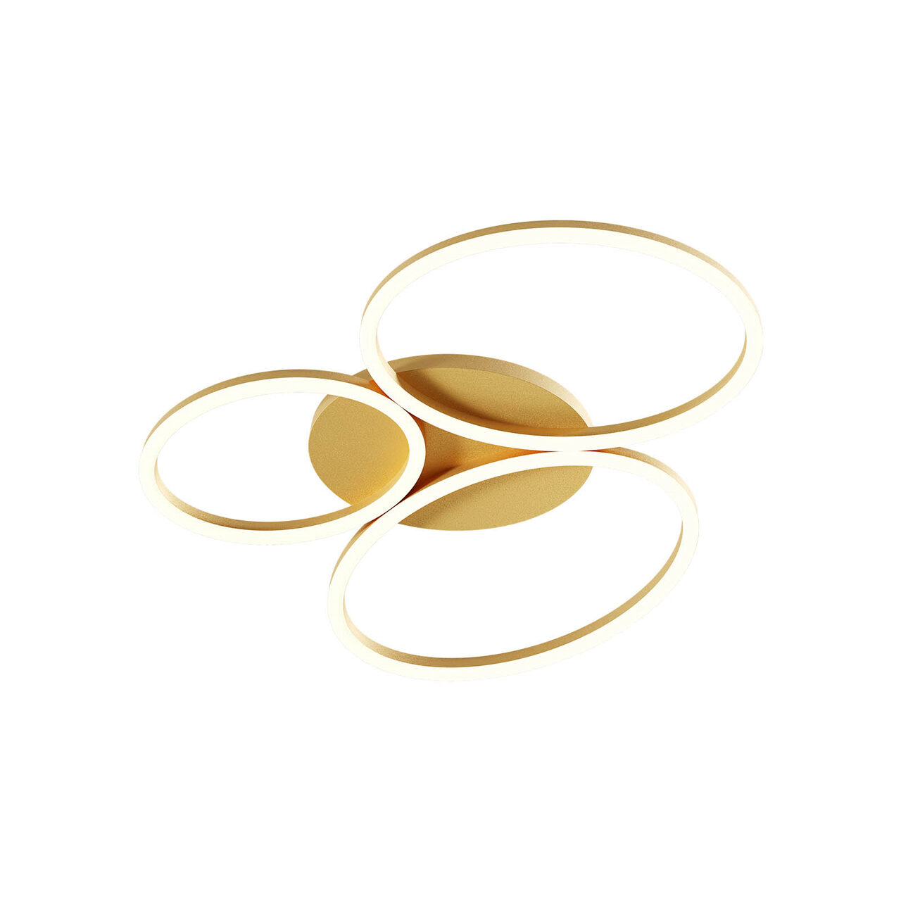 Plafonieră pentru interior, echipată cu LED-uri SMD, cu posibilitate de selectare a temperaturii de culoare a luminii, structură din metal și aluminiu vopsit aur mat, dispersoare din silicon alb opal.