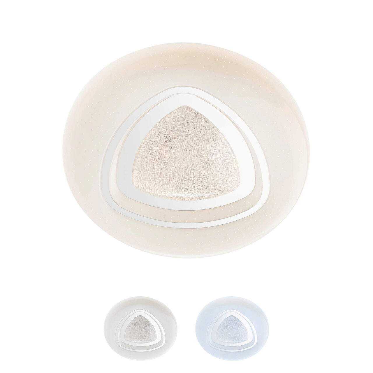 Plafoniera pentru interior echipata cu led-uri SMD alb cald și alb rece, dotata cu sistem de control TUYA. Structura din metal vopsit alb mat, dispersor din metacrylat opal cu decorațiune centrala și ornamente cromate. Livrata cu telecomanda (cu 2 baterii AAA incluse) cu urmatoarele funcții: ON/OFF, 4 programe de funcționare, reglarea intensitații luminoase, setarea temperaturii de culoare a luminii de la alb cald la alb rece, mod lumina veghe.