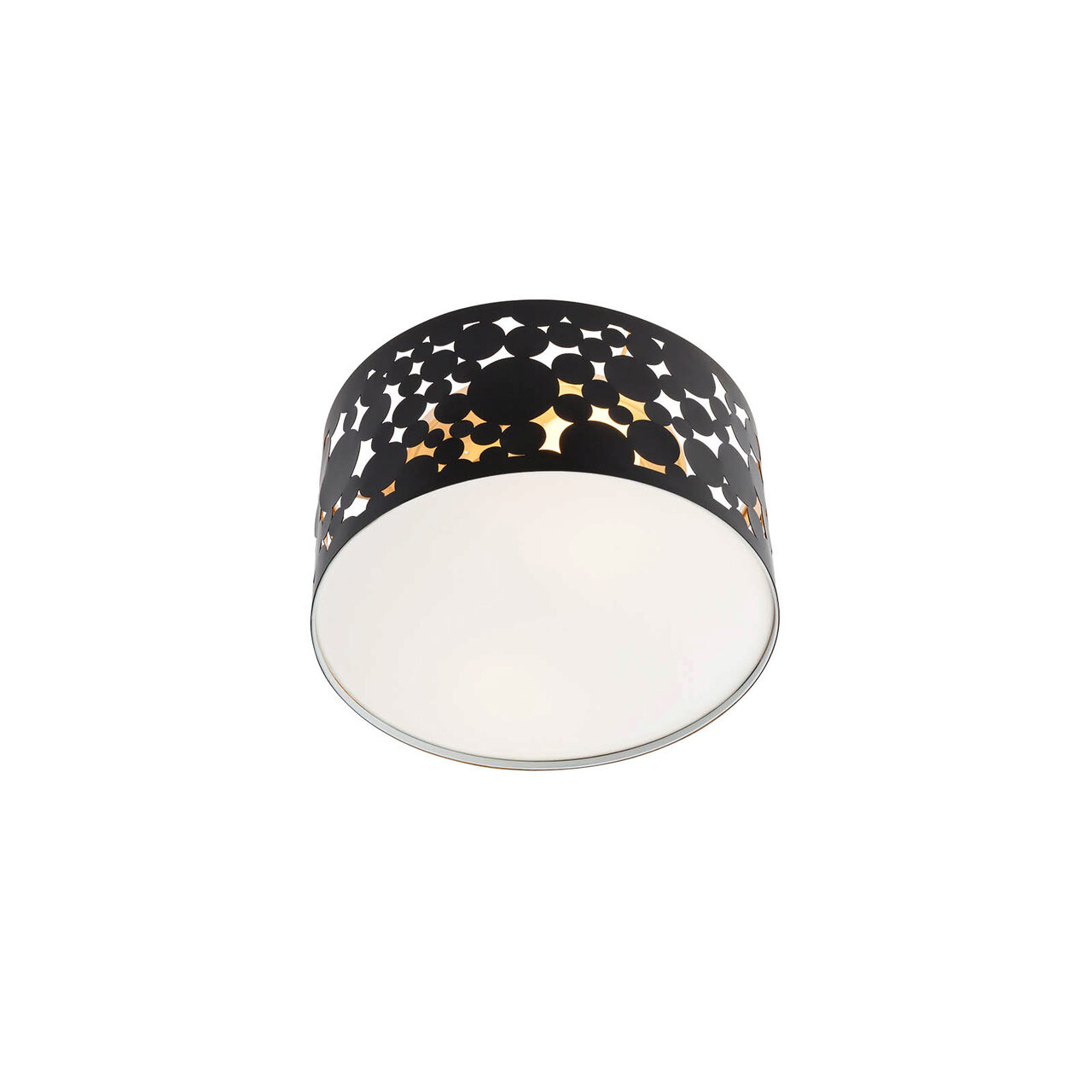 Plafonieră pentru interior, structură din metal cromat, abajur din țesătură culoare neagră pe suport PVC auriu, modelat cu laser, dispersor din PVC alb.