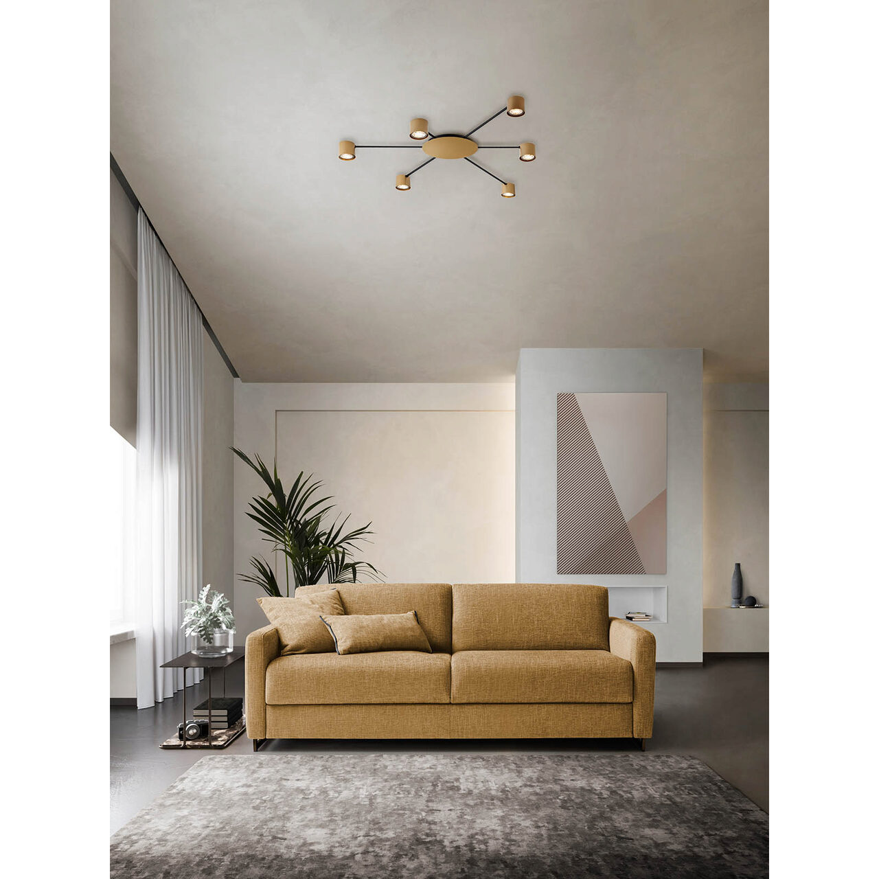 Plafonieră pentru interior, structură din metal vopsită negru mat cu abajururi din metal vopsite auriu mat.