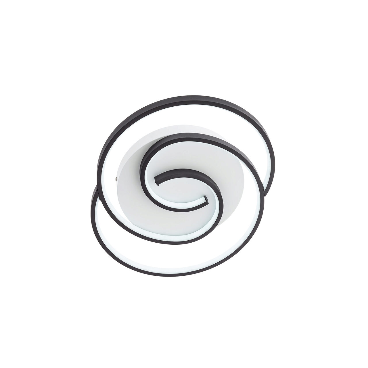 Plafonieră pentru interior echipată cu led-uri SMD, structură din metal vopsit alb mat și brațe în forma de spirală vopsite negru mat cu dispersoare din silicon alb opal. Livrată cu telecomandă (cu 2 baterii AAA incluse) cu următoarele funcții: ON/OFF, 3 programe de funcționare, reglarea intensității luminoase, setarea temperaturii de culoare a luminii de la alb cald la alb rece, timer și mod lumină veghe.