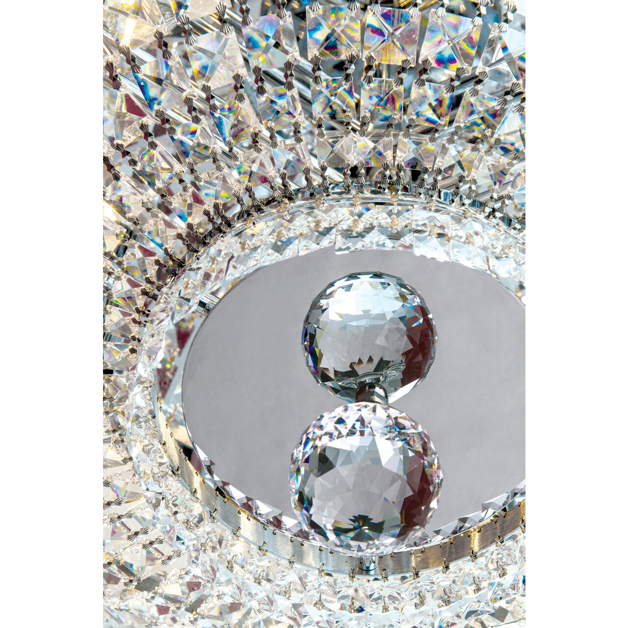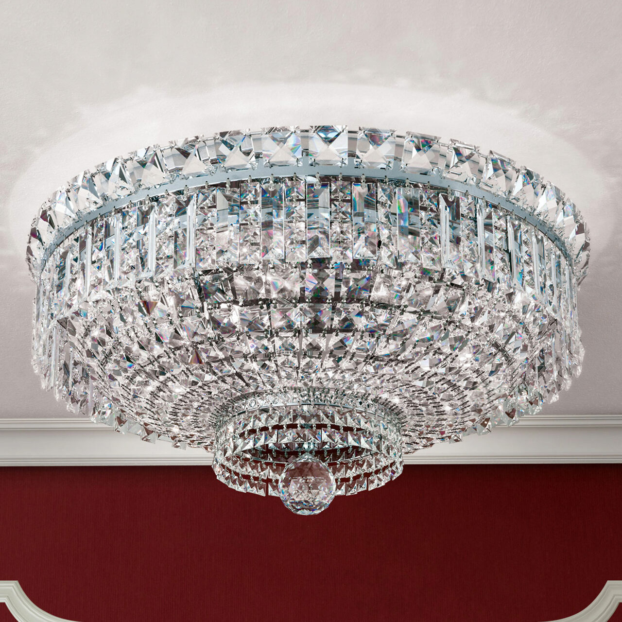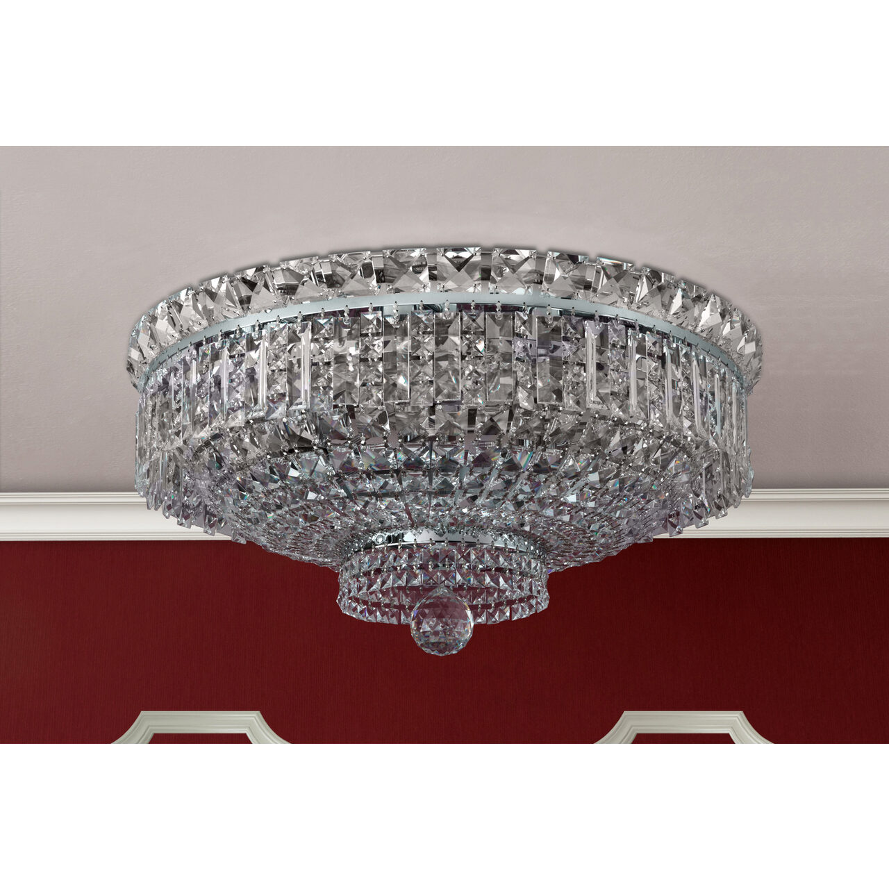 Cu farmecul stilului modern oriental, cu stralucirea spectaculoasa a cristalelor Swarovski, plafoniera Ambassador lucrata manual din alama masiva cromata devine cu siguranta elementul de referinta al oricarei incaperi in care va fi amplasata. Dimensiunile generoase, numarul mare de surse de iluminat contribuie si ele la definirea unui corp de iluminat cu adevarat remarcabil. Plafoniera Ambassador face parte din colectia cu acelasi nume, colectie care cuprinde plafoniere cu diametre de 45, 60,100 si 120 cm, candelabre ce cuprind in productia de serie si produse cu dimensiuni monumentale, lampadare si aplice diverse, toate finisate de exceptie, fie aurite, fie cromate. Mai mult, alama ce formeaza structura acestor corpuri de iluminat (indiferent de tipul finisajului) este protejata cu un strat de lac aplicat la finalul procesului de fabricatie.