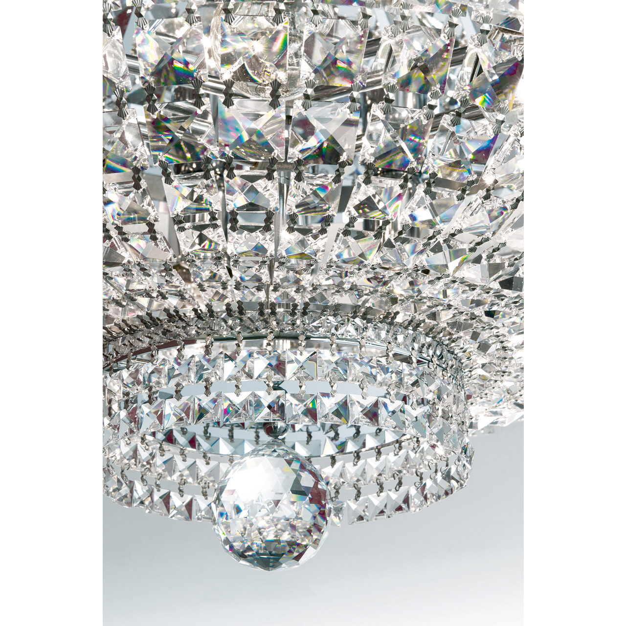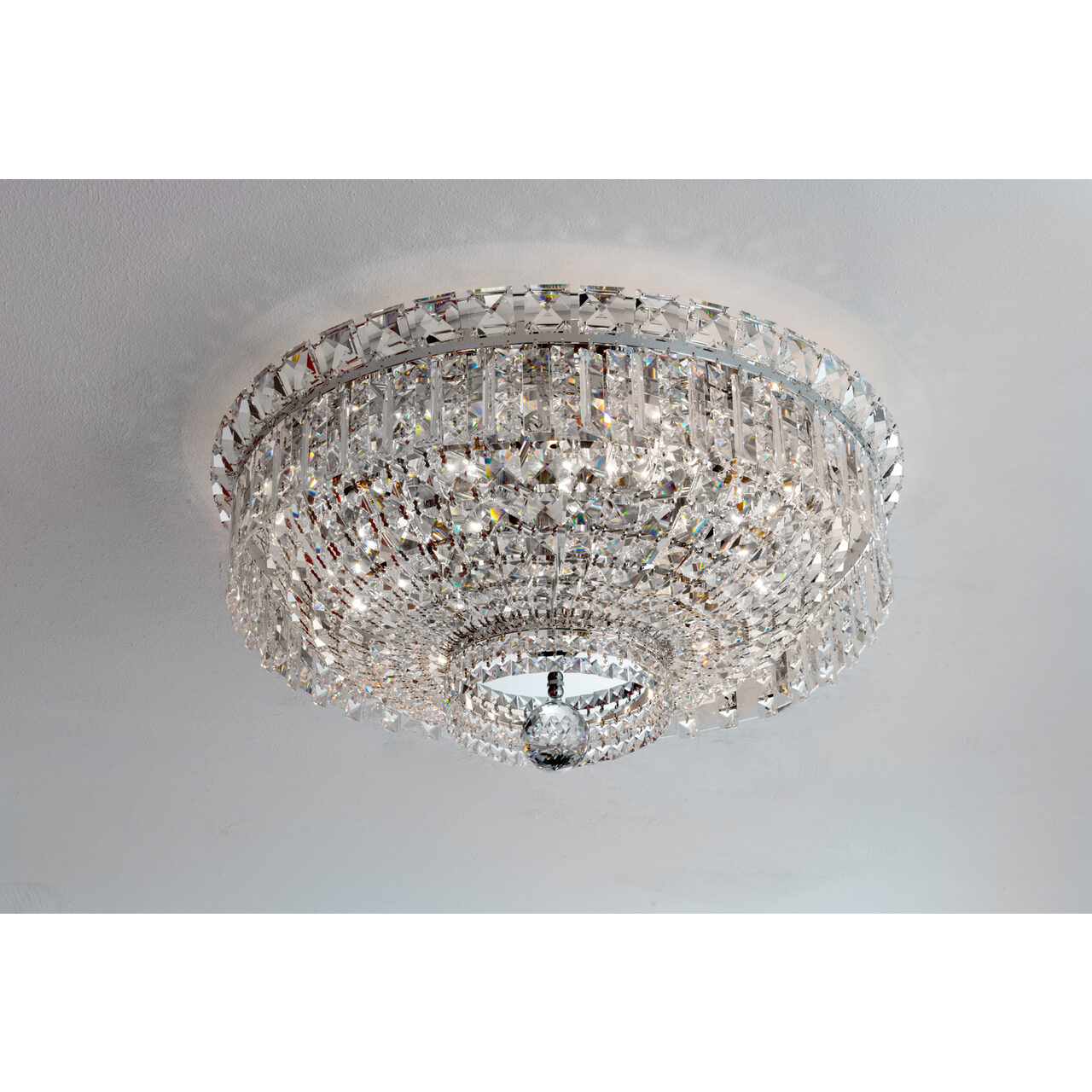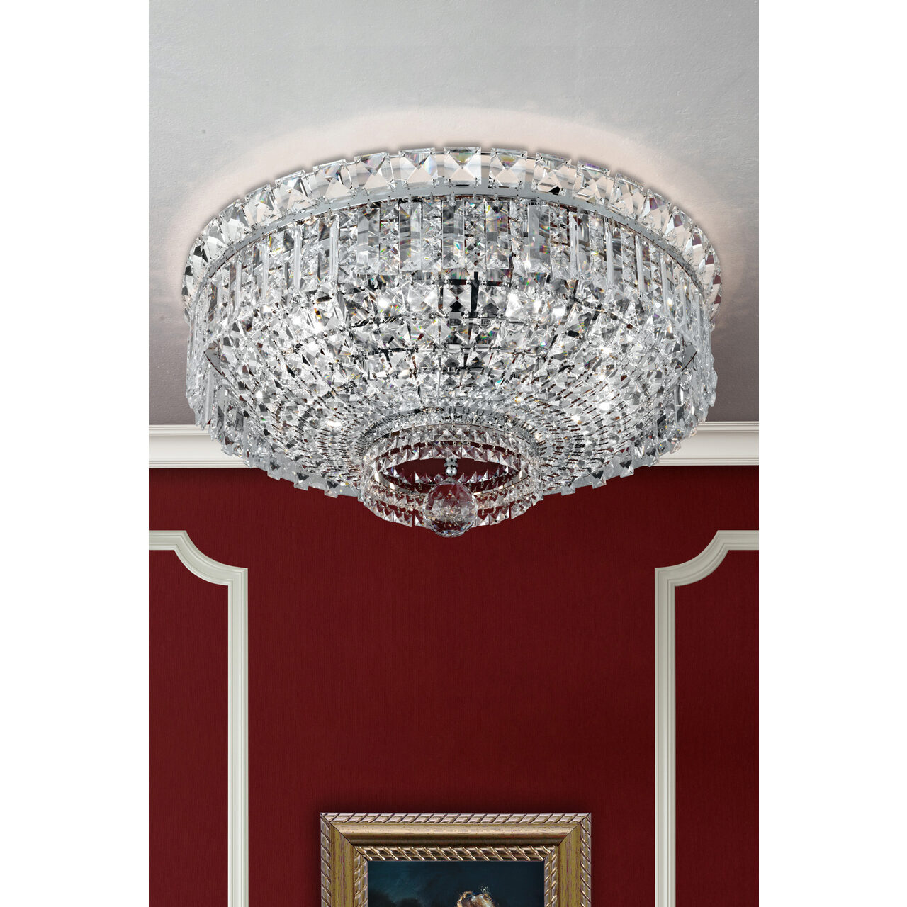 Cu farmecul stilului modern oriental, cu stralucirea spectaculoasa a cristalelor Swarovski, plafoniera Ambassador lucrata manual din alama masiva cromata devine cu siguranta elementul de referinta al oricarei incaperi in care va fi amplasata. Dimensiunile generoase, numarul mare de surse de iluminat contribuie si ele la definirea unui corp de iluminat cu adevarat remarcabil. Plafoniera Ambassador face parte din colectia cu acelasi nume, colectie care cuprinde plafoniere cu diametre de 45, 60,100 si 120 cm, candelabre ce cuprind in productia de serie si produse cu dimensiuni monumentale, lampadare si aplice diverse, toate finisate de exceptie, fie aurite, fie cromate. Mai mult, alama ce formeaza structura acestor corpuri de iluminat (indiferent de tipul finisajului) este protejata cu un strat de lac aplicat la finalul procesului de fabricatie.