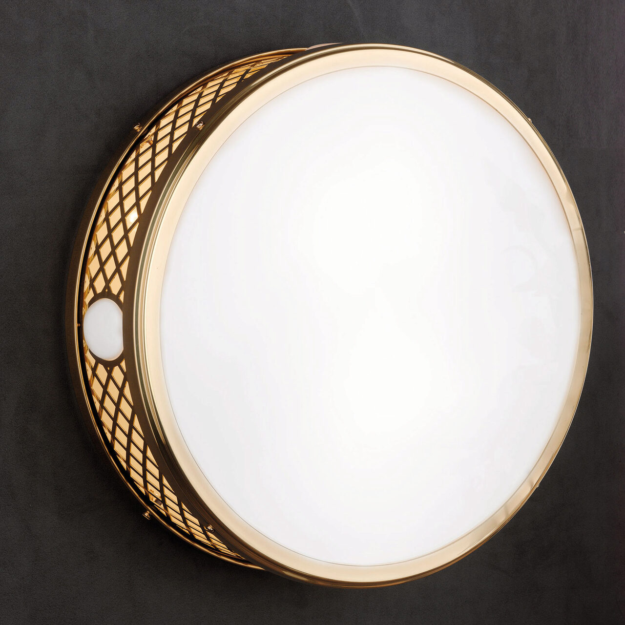 Plafoniera Alt Wien lucrata manual din alama masiva lucioasa, realizata in stilul art nouveau/secession austriac interpretat. O plafoniera in care se regasesc liniile drepte si curbe atat de caracteristice stilului art nouveau, linii deschise care ofera dinamism si ritm si care definesc un corp de iluminat inconfundabil. Eleganta ei este data si de asocierea finisajelor de cea mai buna calitate a alamei cu albul stralucitor al abajurului opal. Plafoniera Alt Wien face parte din colectia cu acelasi nume care cuprinde plafoniere, aplice, candelabre, veioze si lampadare din alama lucioasa, patinata si nichelata. Alama ce formeaza structura acestor corpuri de iluminat (indiferent de tipul finisajului) este protejata cu un strat de lac aplicat la finalul procesului de fabricatie.