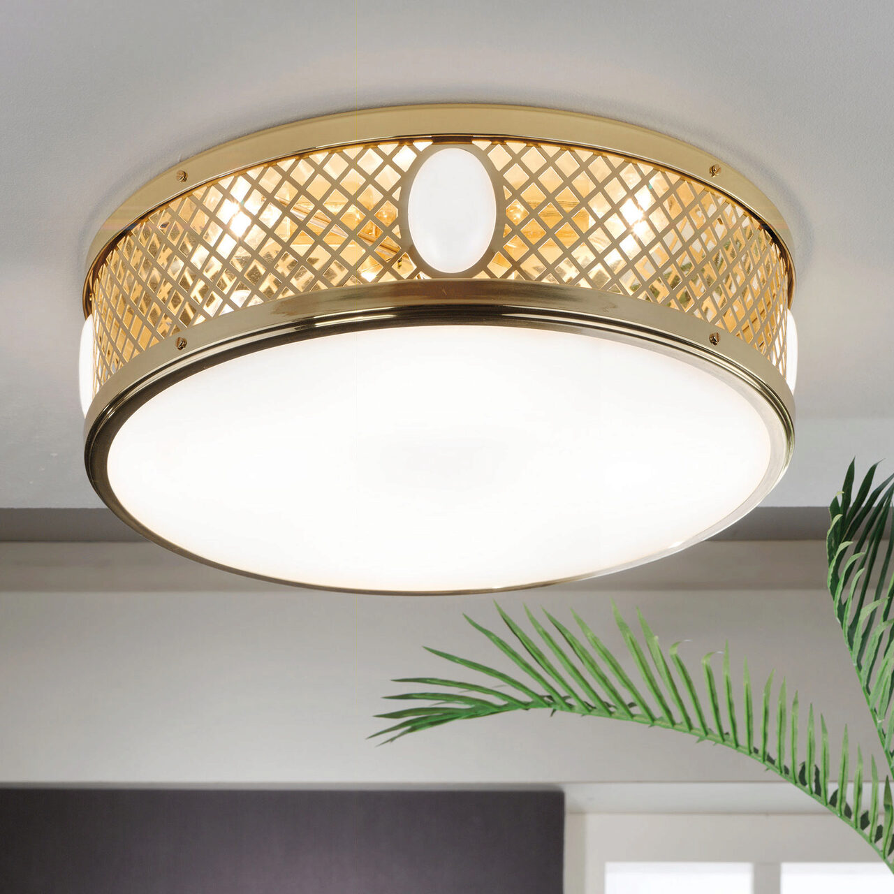 Plafoniera Alt Wien lucrata manual din alama masiva lucioasa, realizata in stilul art nouveau/secession austriac interpretat. O plafoniera in care se regasesc liniile drepte si curbe atat de caracteristice stilului art nouveau, linii deschise care ofera dinamism si ritm si care definesc un corp de iluminat inconfundabil. Eleganta ei este data si de asocierea finisajelor de cea mai buna calitate a alamei cu albul stralucitor al abajurului opal. Plafoniera Alt Wien face parte din colectia cu acelasi nume care cuprinde plafoniere, aplice, candelabre, veioze si lampadare din alama lucioasa, patinata si nichelata. Alama ce formeaza structura acestor corpuri de iluminat (indiferent de tipul finisajului) este protejata cu un strat de lac aplicat la finalul procesului de fabricatie.