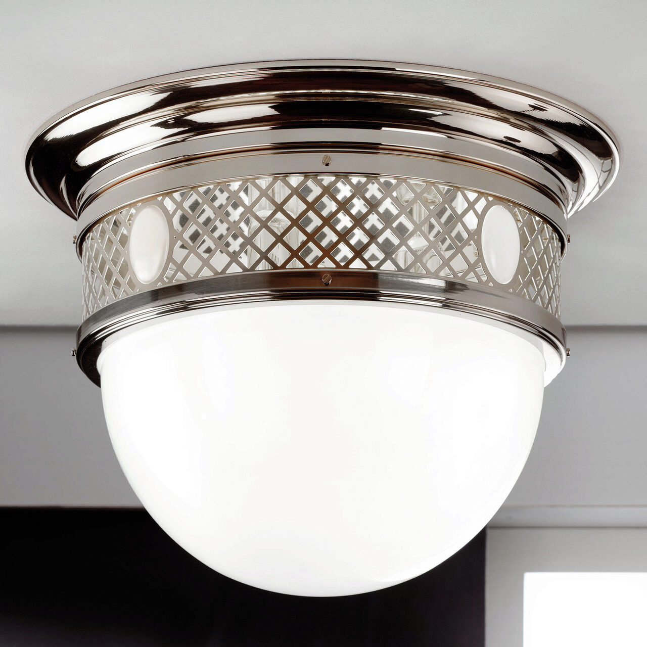 Plafoniera Alt Wien lucrata manual din alama masiva patinata, realizata in stilul art nouveau/secession austriac interpretat. O plafoniera in care se regasesc liniile drepte si curbe atat de caracteristice stilului art nouveau, linii deschise care ofera dinamism si ritm si care definesc un corp de iluminat inconfundabil. Eleganta ei este data si de asocierea finisajelor de cea mai buna calitate a alamei cu albul stralucitor al abajurului opal. Plafoniera Alt Wien face parte din colectia cu acelasi nume care cuprinde plafoniere, aplice, candelabre, veioze si lampadare din alama lucioasa, patinata si nichelata. Alama ce formeaza structura acestor corpuri de iluminat (indiferent de tipul finisajului) este protejata cu un strat de lac aplicat la finalul procesului de fabricatie.