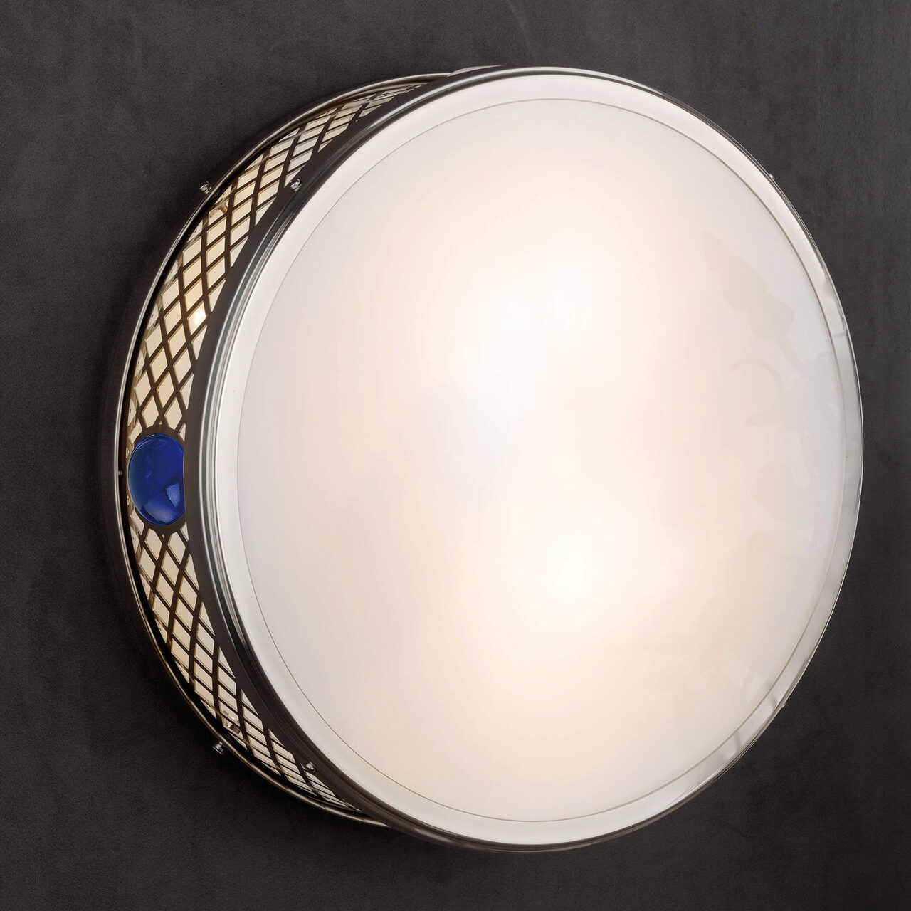 Plafoniera Alt Wien lucrata manual din alama masiva nichelata, realizata in stilul art nouveau/secession austriac interpretat. O plafoniera in care se regasesc liniile drepte si curbe atat de caracteristice stilului art nouveau, linii deschise care ofera dinamism si ritm si care definesc un corp de iluminat inconfundabil. Eleganta ei este data si de asocierea finisajelor de cea mai buna calitate a alamei cu albul stralucitor al abajurului opal. Plafoniera Alt Wien face parte din colectia cu acelasi nume care cuprinde plafoniere, aplice, candelabre, veioze si lampadare din alama lucioasa, patinata si nichelata. Alama ce formeaza structura acestor corpuri de iluminat (indiferent de tipul finisajului) este protejata cu un strat de lac aplicat la finalul procesului de fabricatie.