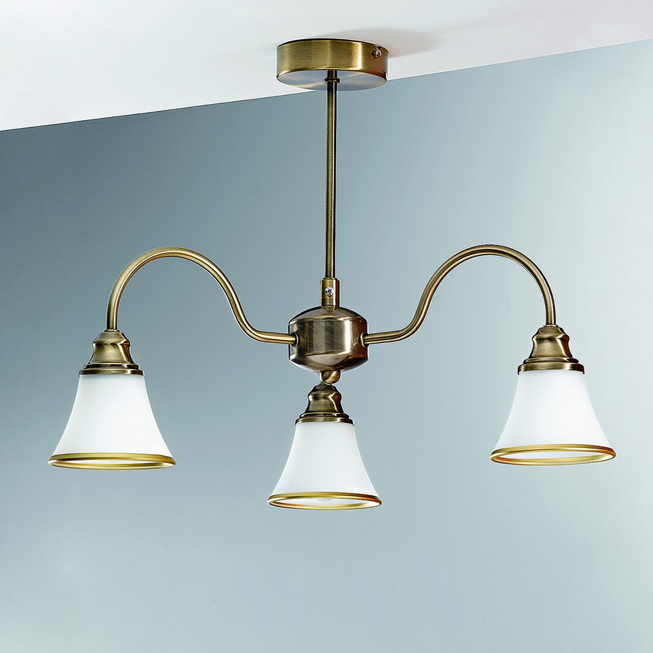 Plafoniera clasica cu note vintage, finisata alama patinata, cu abajururi din sticla opal cu bordura bronz.