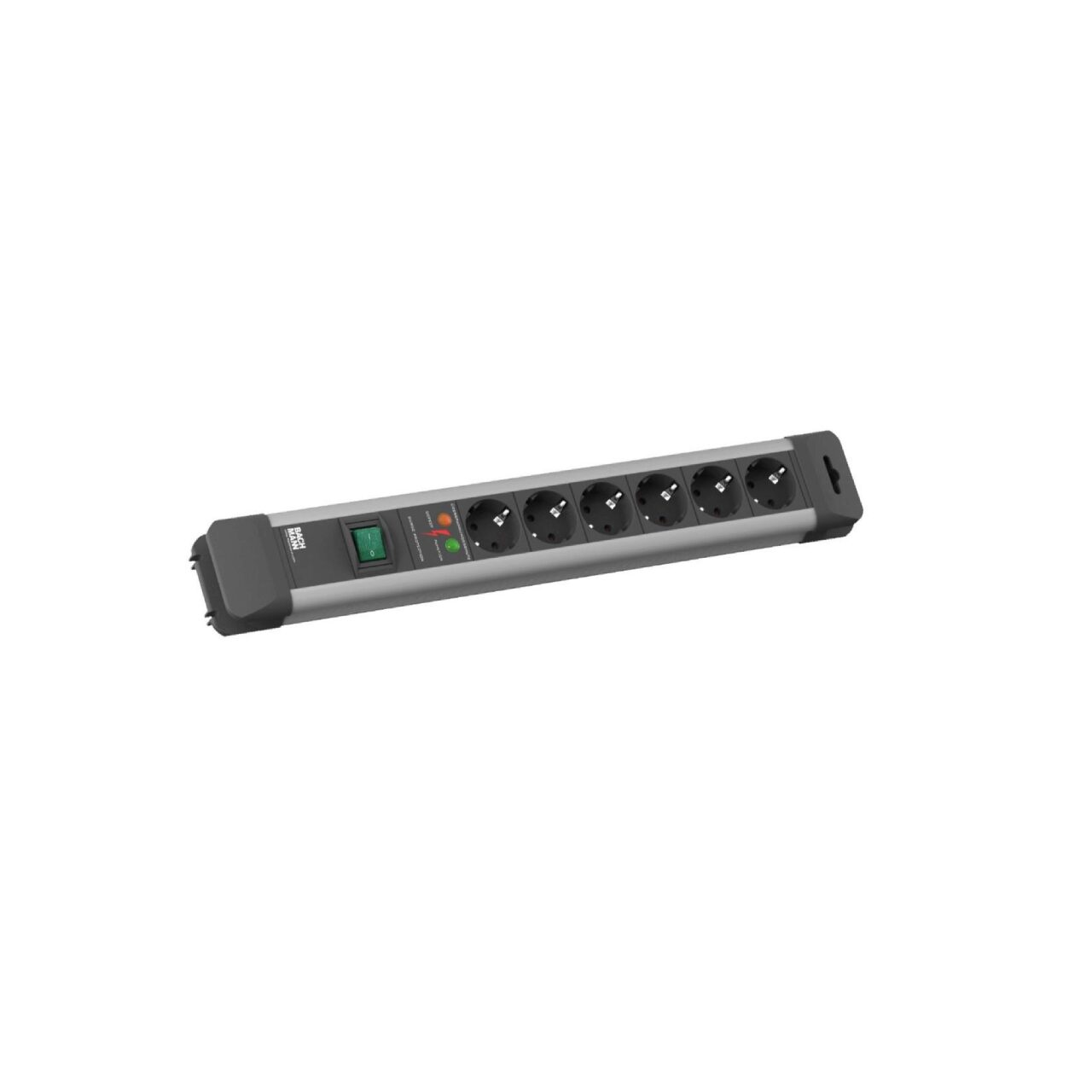 Prelungitor cu 6 prize Schuko si comutator, cablu de alimentare de 2 metri H05VV-F 3x1.5 mmp cu fisa unghiulara contact de protectie, din gama Connectus 330.104R, Bachmann.