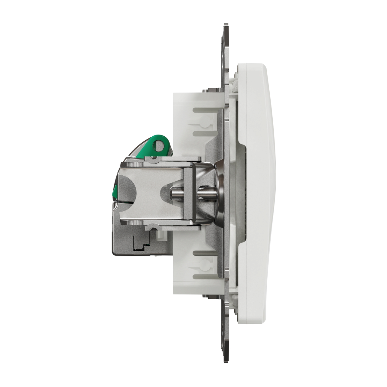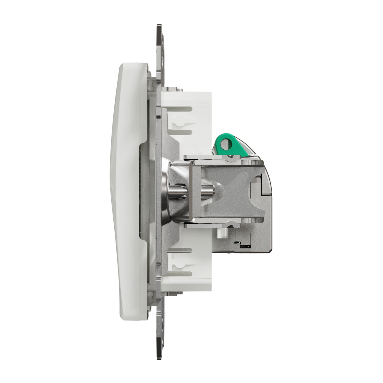 Priza date RJ45 Cat.5e STP alba, realizata din material termoplastic stabilizat ABS-UV, finisaj lucios, netratat, mecanism cu suport de fixare pentru montaj incastrat si protectie IP20.