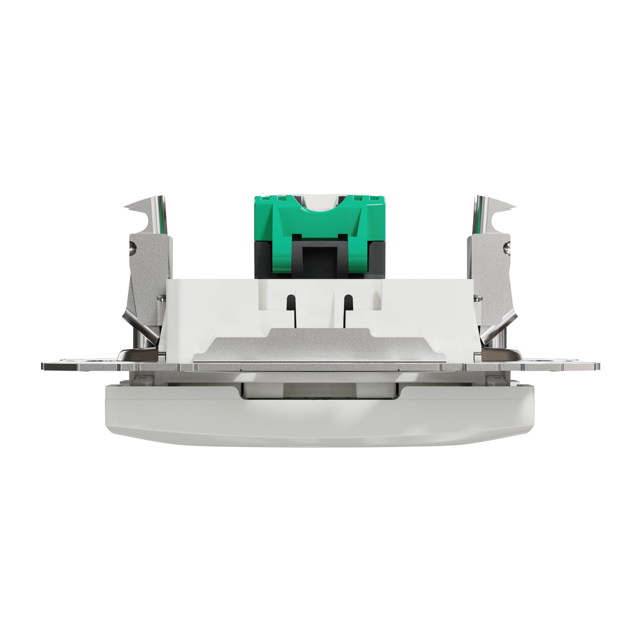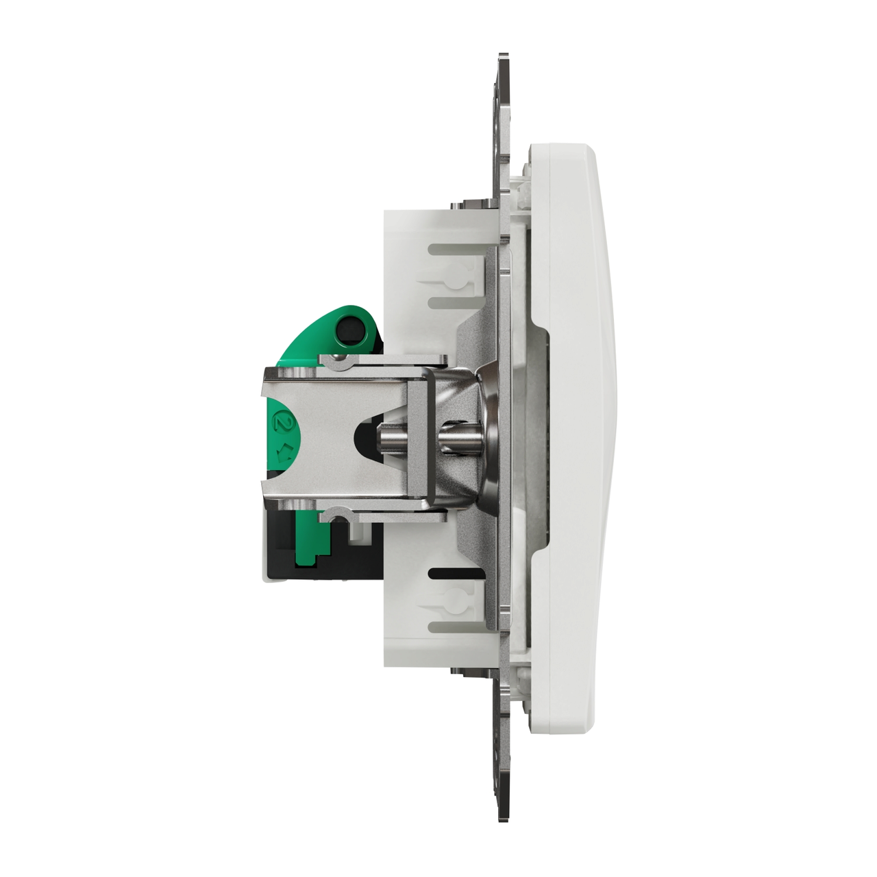 Priza date RJ45 Cat.5e UTP alba, realizata din material termoplastic stabilizat ABS-UV, finisaj lucios, netratat, mecanism cu suport de fixare pentru montaj incastrat si protectie IP20.