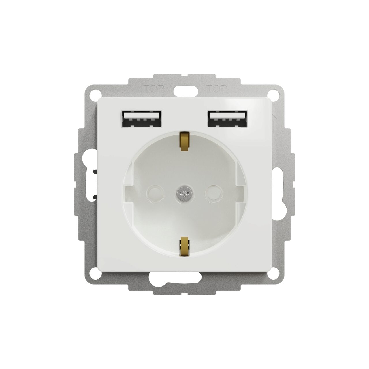 Priza simpla alba 2P+E+2 USB 2.4 A cu obturatoare, curent nominal 16 A, tensiune 250 V AC, realizata din policarbonat, detine doua module, montaj incastrat, mecanism cu suport de fixare, finisaj lucios si protectie IP20.