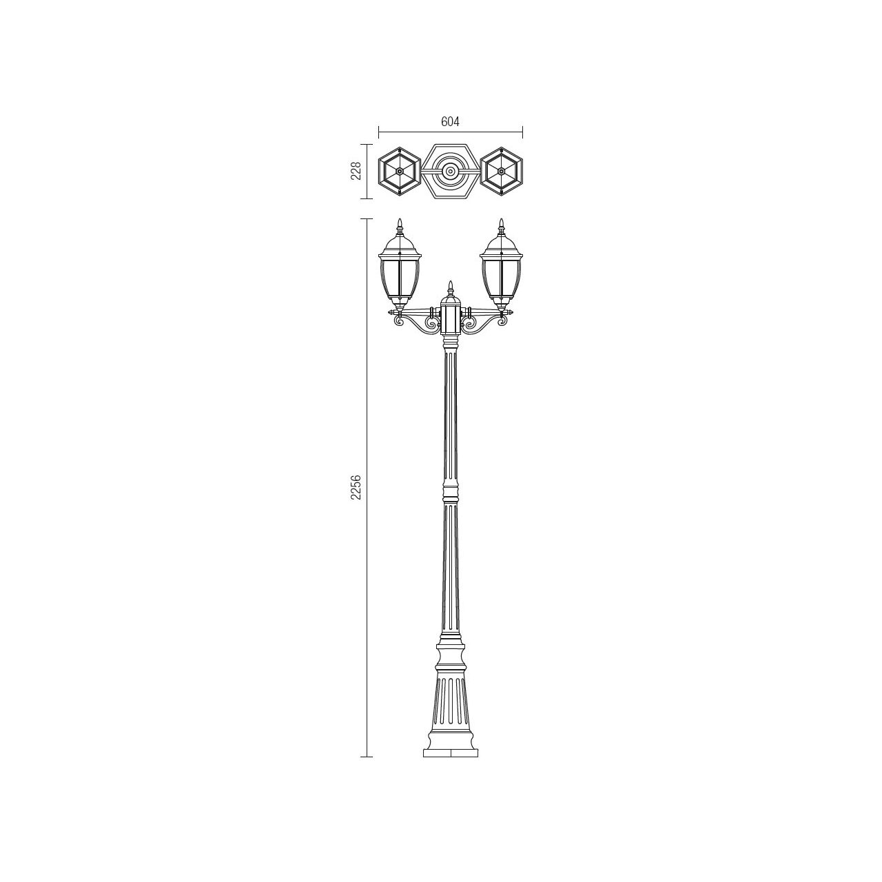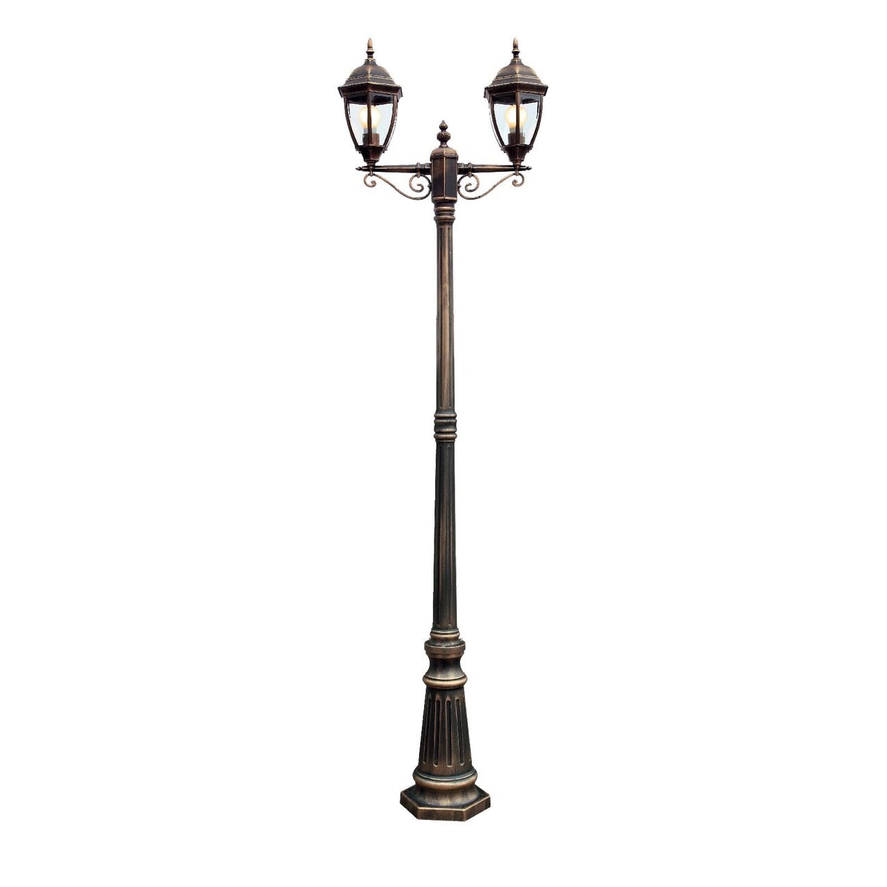 Stalp pentru exterior, corp din aluminiu turnat sub presiune finisat negru antic cu patina aur, dispersoare din sticla fațetata transparenta.