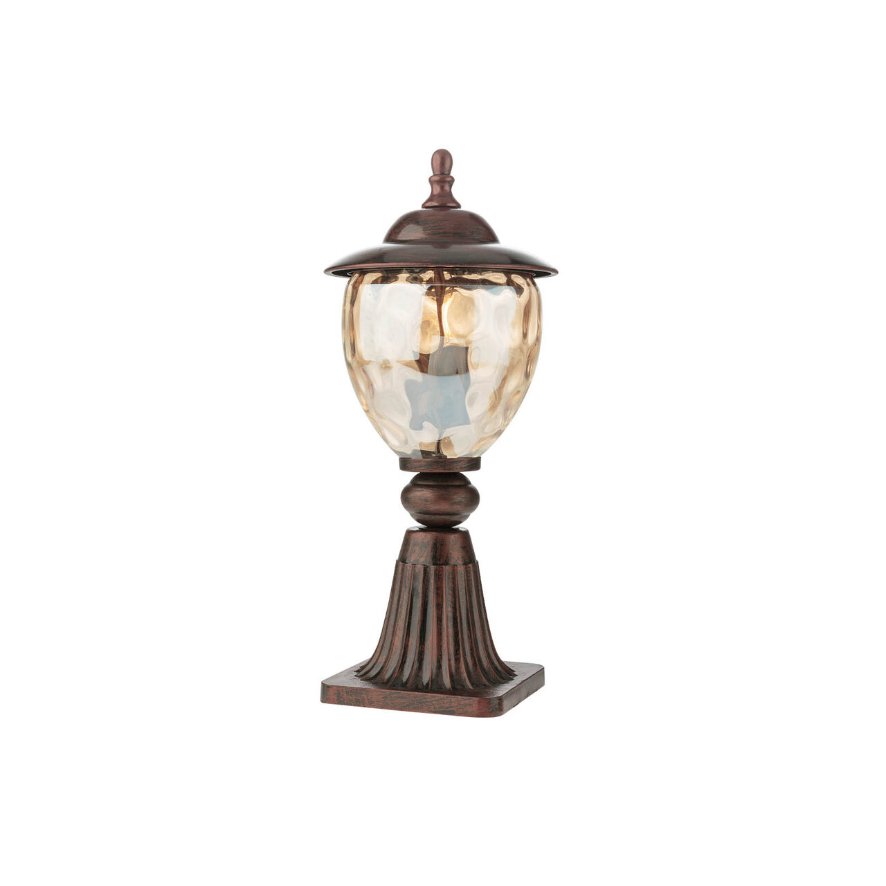 Stalpișor pentru exterior, structura din metal finisat negru cu patina cupru, dispersor din sticla tip „water glass'' culoare cognac.