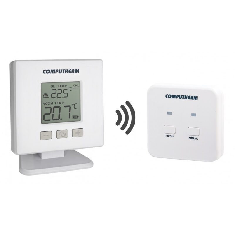 Termostat digital cu radiofrecventa fara fir (wireless) neprogramabil Computherm Q32RF. Termostatul de camera Computherm Q32RF este adecvat pentru comanda unui aparat de incalzire sau de climatizare, fiind compatibil cu majoritatea centralelor termice comercializate in Romania. Se poate conecta foarte usor la orice cazan sau aparat de climatizare daca acesta este dotat cu cleme de conexiune, cu ajutorul unui cablu cu 2 fire indiferent daca tensiunea de comanda, este 24 V sau 230V. Este usor de folosit, are un afisaj digital de dimensiuni mari, optiune de cablare a termometrului si o modalitate usoara de comutare intre modurile racire si incalzire.