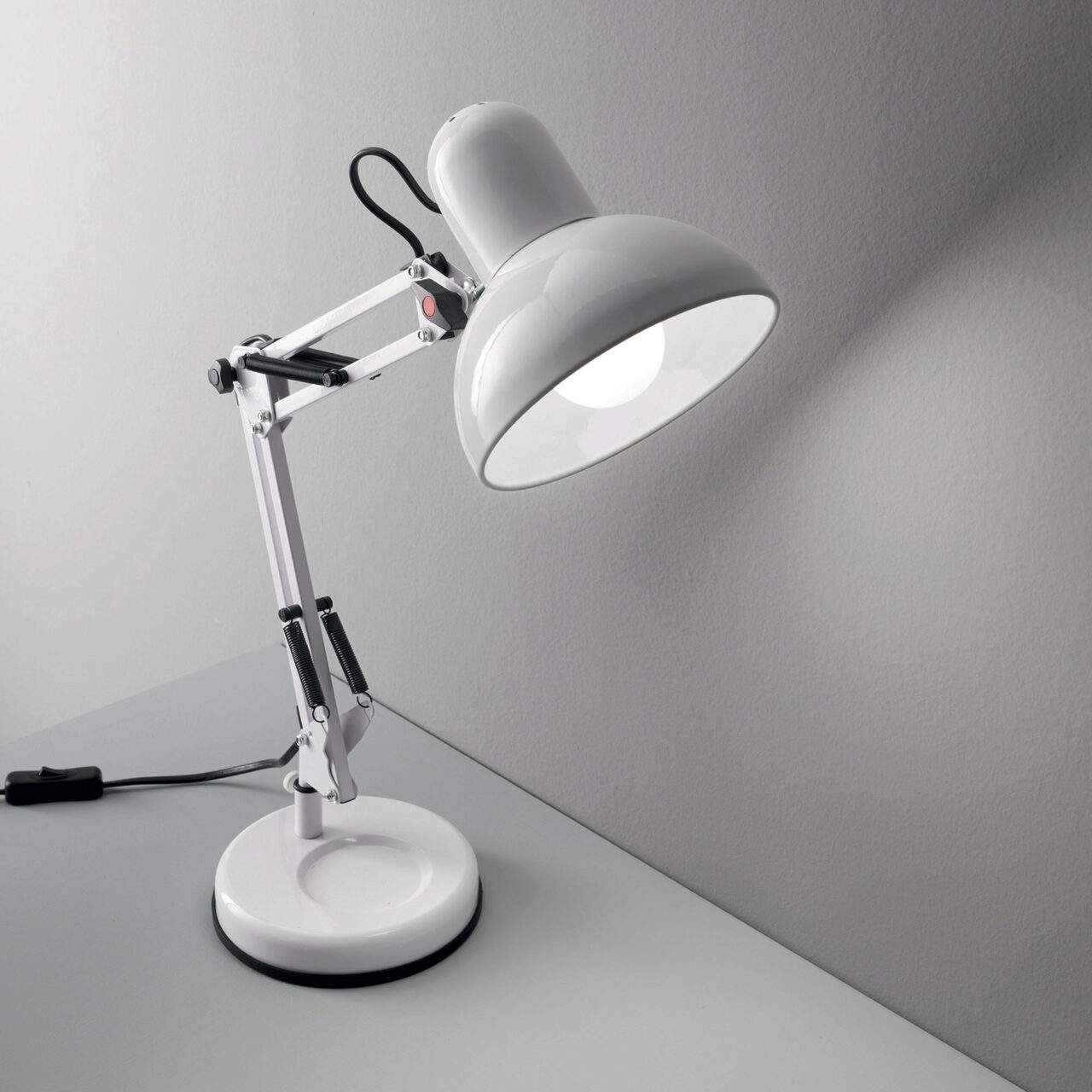 Veioza tehnica din colectia Kelly din metal cu finisaj alb mat. Brațul este arcuit și dotat cu arc de siguranță, iar abajurul orientabil.